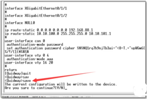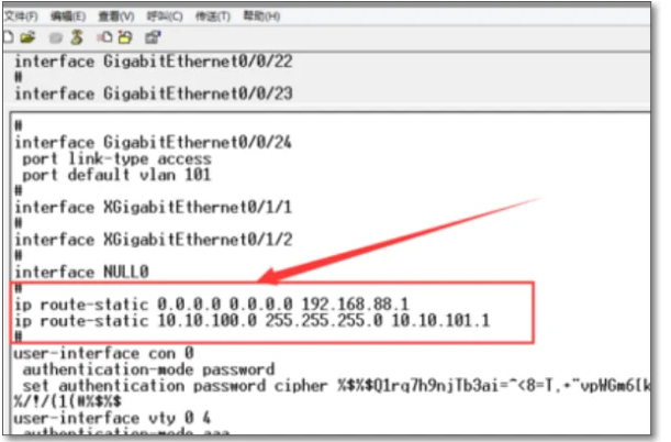 4.然后配置一个指定的静态路由,IP route-static 10 . 10 . 100 . 0 255 . 255 . 0 10.10.101.1,也就是说对10.10.100.0/24网段的访问地址是10 . 10 . 101 . 1。